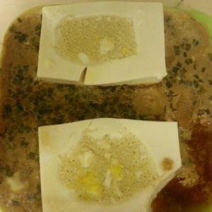 将半块豆腐切半,挖空豆腐中间的部分