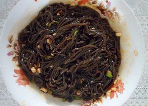 泡好的蕨根粉凉凉的比较有弹性,在与黄瓜丝和步骤2放在一起,拌匀即可。