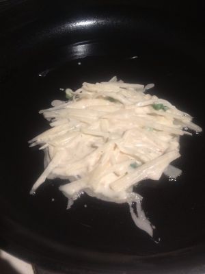 泡好的土豆丝里加入少量面粉和清水,用筷子搅拌好。放入小葱,盐和黑胡椒粉调味。