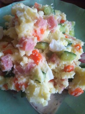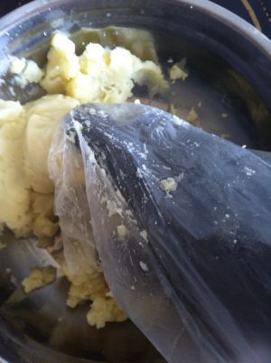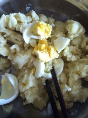 土豆弄成土豆泥(戴上隔热手套,套上食品袋,抓几下就搞定了)
