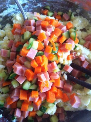 黄瓜,胡萝卜,火腿切丁,炒熟待用。