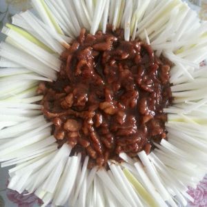 少油把蒸熟的甜面酱炒一下把肉丝倒入翻炒至肉全粘上酱盛出装盘。