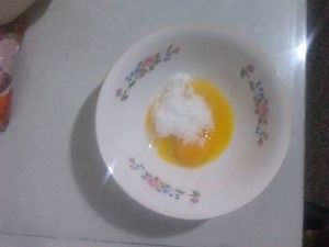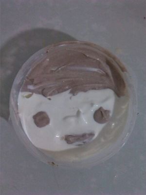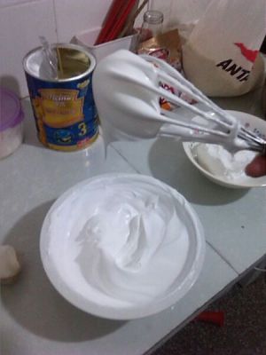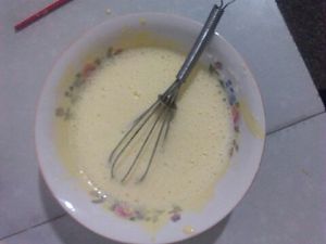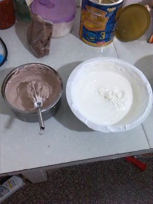 将奶油分两部分,分别与另外两分蛋奶液拌匀(喜欢水果口味的也可以在蛋奶液中加入打碎的果泥)