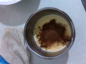 将蛋奶液分成两部分,先将一部分加入可可粉拌匀