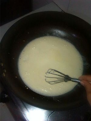 将蛋奶液倒入锅中用小火加热。边加热边搅拌均匀,防止蛋液结块凝固,影响口感