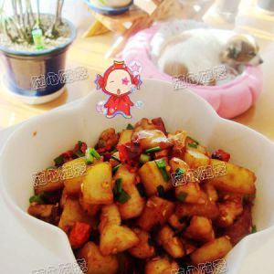 最后把鸡丁、土豆丁倒入,放调料和蒜苗调味。