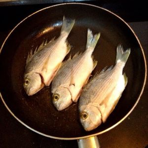 平底锅下油,鱼用厨房纸吸干水分后,放入煎至两面金黄,淋入适量的黄酒。