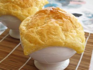 将汤盛入碗中,再放上酥皮,可以刷一层蛋液。我是直接买的酥皮。