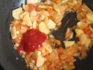 锅内倒入油,油热后放入洋葱煸炒出香味。再放入西红柿丁和土豆片,炒出汁后加入适量番茄酱炒匀
