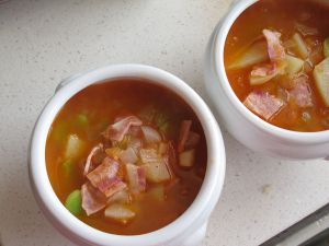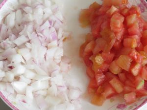 洋葱去皮切丁,西红柿用开水烫一下去皮切丁,培根切片备用