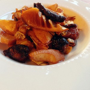 炒锅中加入比平时炒菜稍多一些量植物油,油热后放入笋块,中火煸至笋块水气挥发掉,放入香菇块,冰糖,炒至冰糖完全融化后烹入料酒,生抽,翻炒均匀上色后盖上锅盖焖2-3分钟,关火装盘。