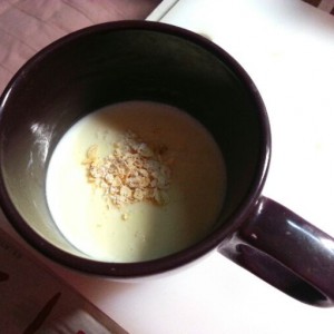 牛奶倒杯子里(我喝茶的杯子都用上了。)(别加太满。一会还要加蛋清。)。加里些全脂奶粉炼乳。提高脂肪含量。然后放微波炉里叮一下。叮到沸腾。取出放凉。