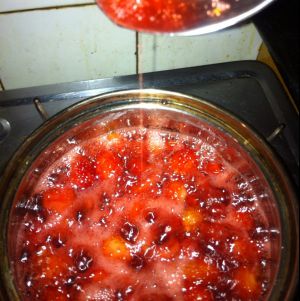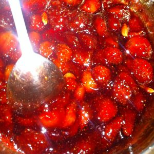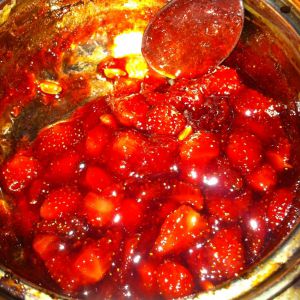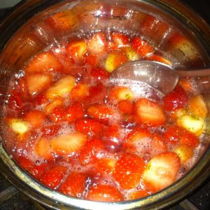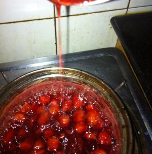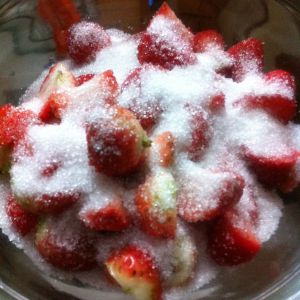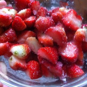撒上白糖腌制15分钟。白糖覆盖住草莓就好。