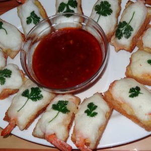 蛋黄 蛋清分置两碗内,加入干淀粉打成蛋黄糊 蛋清糊,在面包片上先抹上蛋黄糊,将腌好的虾平铺在面包片上,在将蛋清糊抹在虾上面,覆盖虾肉。