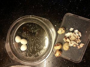 等鹌鹑蛋冷却后,放置一碗凉开水。剥好蛋壳的鹌鹑蛋放进凉开水里洗干净。