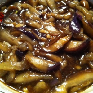 锅中放入油爆香姜蒜,放入调好的汁煮开放入茄子,翻炒加葱花和鸡精,收汁出锅