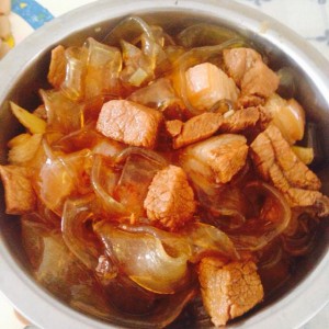 白糖适量熬成红色倒入猪肉、翻炒后加入水炖煮,再加入宽粉炖熟