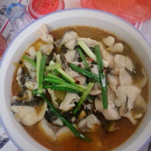 把葱段摆在鱼上面,把锅里热的油淋在容器里,好了,好吃爽口的酸菜鱼做好了