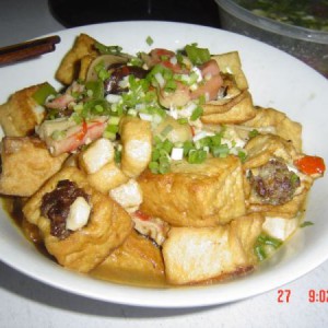 煎好的豆腐块先盛出,锅内留油,倒入青红椒、香菇丝、鱼丸、虾丸翻炒,5分钟后填入适量清水,倒入耗油、盐、生抽、胡椒面、鸡精,把炸好的豆腐块摆入锅,盖上锅盖