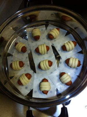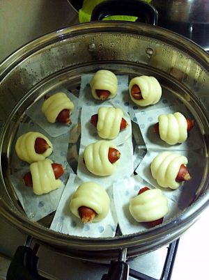 把二次发酵好的肠仔包用冷水开始蒸15分钟后关火闷10分钟防止回缩即可~