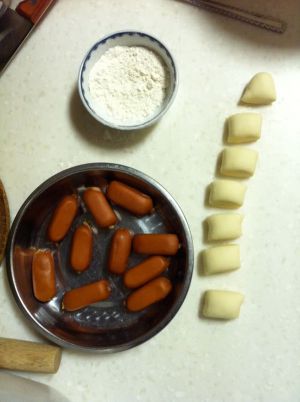 准备好脆皮肠,将发酵好的面团加入一点干面粉重新揉成团,压扁再揉成长条切段,将一小段面团,用双手搓成小长条围着脆皮肠卷2至3圈即可。