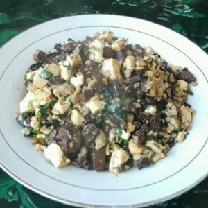 下豆腐、猪血,翻炒,加适量草果粉和半汤匙酱油,翻炒。不需要技术,不糊锅就行。多炒一下,干一些更香。出锅前加适量盐。