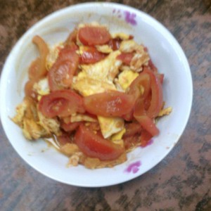 下锅炒番茄,炒软之后加糖鸡蛋翻炒,然后装盘。