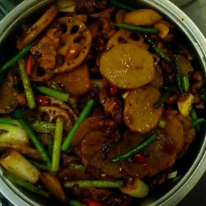 把肉,土豆,藕片等一起倒入锅中翻炒,倒入酱油调色,孜然粉调味。炒匀后关火加味精或者鸡精(不喜欢吃可以不加,味道一样好)。可以出锅了!