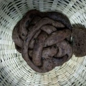 接下来做造型,这个时候把巧克力切成碎屑,滚面团的时候就可以把巧克力融合进去了。我做的绣花馒头,法棍馒头