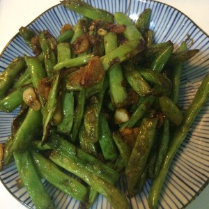 四季豆洗干净,去丝,分段,锅里热油(比炒菜多一点点),油热撒入少许盐,以免嘣油,放入四季豆,煎至起泡为止,把四季豆拨至一边,(这是不粘锅版,如果是铁锅可以炸至起泡)滴入少许油,放入虾米,葱姜蒜末,少许生抽,花椒粉。爆香,翻炒,放入少许蚝油即可.