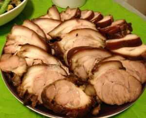 将肘子去骨切花刀(不切碎就是划几下腌制时好入味),放入黄酒+花雕酒(事先把它们混合在一起调一下再用,比例是一比一)、酱油、黄酱和秘制调料(只有一点点就够了)腌制八个小时(期间要翻身)