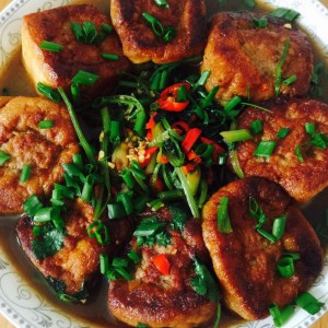 第三步:锅热油,把放肉的那面放锅里煎,直到煎黄,然后放水,酱油,蚝油,适量盐(肉里面有盐,所以盐要少放点),直到把汤汁快干的时候把香菜跟葱放下去,能吃辣椒的可以自己适量加点辣椒。装盘前用生粉跟酱油少量水勾芡倒入锅里。