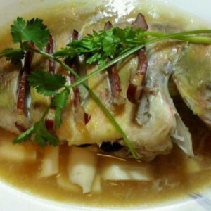 葱,姜,蒜,香菇装入鱼肚。春笋铺在碟子底部,腊肉插入鱼身横刀中,浓汤宝切片放鱼身上,花雕酒倒入盘中。