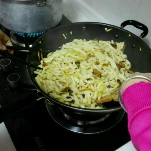 旁边的锅正在烧开水烫面条,烫熟的面条捞出用菜蓝子沥下水…把炒锅倒入油烧热,把香菇、豆腐干、葱白、放下去加盐和几滴酱油(或鱼露)炒几分钟,待香味充分出来了再把瘦肉放下去爆炒几分钟、加入包菜…最后把面条倒进去一起炒加点胡椒粉,加点盐、酱油、洒上葱叶子炒好出锅