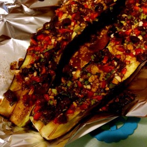 将调料铺盖在茄子上,放入烤箱150度烤30-40分钟。