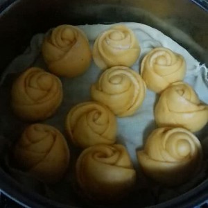 将花心放入面饼中卷好,用刀在筷子压的印上切开,玫瑰花就做好了,继续醒发20分钟