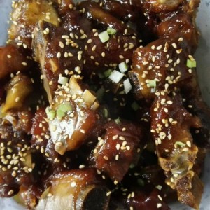 把排骨剁成自已喜欢的长度用凊水煮3O分钟捞起把水晾干然后用生姜和生抽淹2O分钟,再把锅中倒油把排骨炸至金黄。
