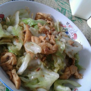 准备材料:圆菜手撕小块,鸡胸肉切成薄片用少许粉面、盐、花椒面腌制备用,取一颗蒜切片备用