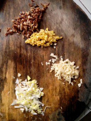 葱姜蒜三兄弟,统统切末。香肠切丁。