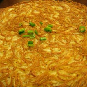 锅中到入油烧至冒烟(最好用平底锅),再加入拌好的土豆丝煎至金黄,翻锅(如果不会的话,可以先倒入盘中再翻入锅内)。