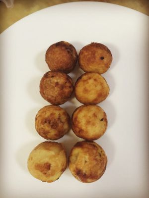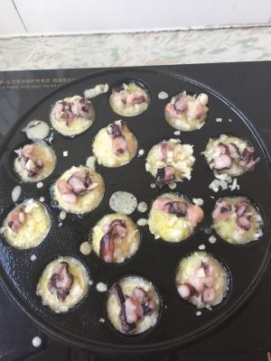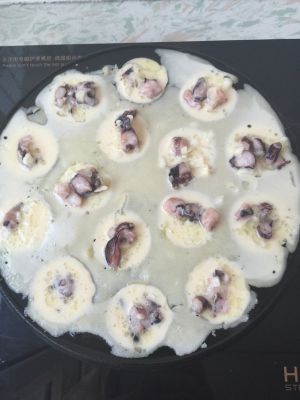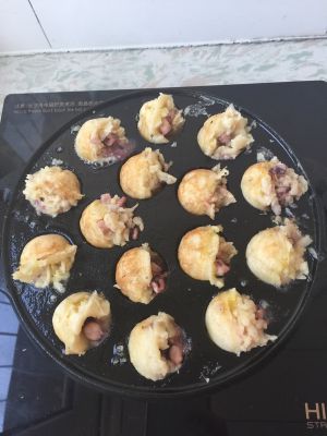 待底下面糊成型后,一点一点边翻转丸子,边往孔里塞外面后倒的面糊