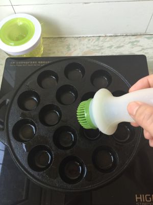 烤盘大火预热,刷上一层油(外面一层,孔里1/4油)