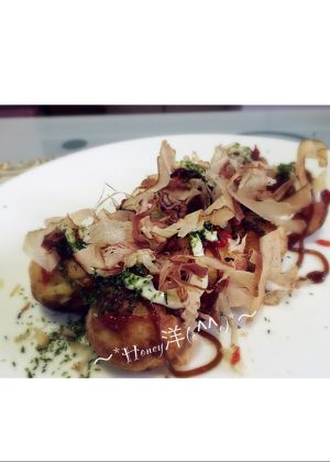 装盘,撒上章鱼烧酱、番茄酱、沙拉酱、海苔粉、柴鱼片,香香,美美哒~