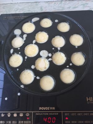 油热后,转小火,在烤盘孔中倒入1/2的面糊