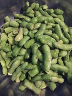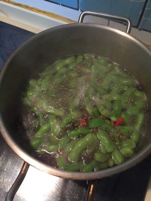 放入毛豆,大火烧开转小火盖上锅盖煮10分钟后关火焖5~10分钟。