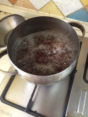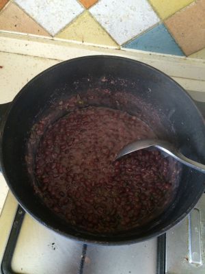 开水与红豆(泡好的)3:1,(也可以用牛奶替代水哦),先将水煮沸再下豆子,防粘锅哦~豆豆大火煮开十分钟,开至最小火,加盖炖上半个小时
