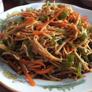 水烧开,先放入洗净的金针菇,然后青椒丝,胡萝卜丝烫好捞出放入冷开水中浸泡一下。