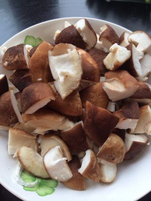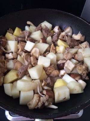 放入姜、牛肉,炒出水分,水分差不多炒完了放酱油,土豆、香菇
