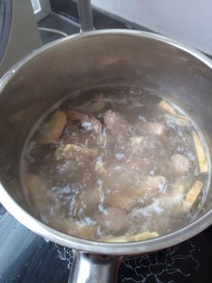 准备姜(拍碎)花椒,大料,料酒,酱油,一碗水