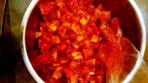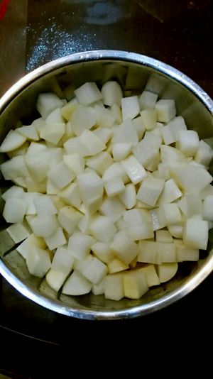 切成1~2厘米见方的小块,撒入盐拌匀,静置一会儿,倒掉挱出来的萝卜水,再撒些食盐拌匀,出水后再倒掉。这样反复做四五遍,撒些食盐拌匀,放入冰箱腌一晚上。转天取出用凉水冲洗,以免过咸,之后控干水份。